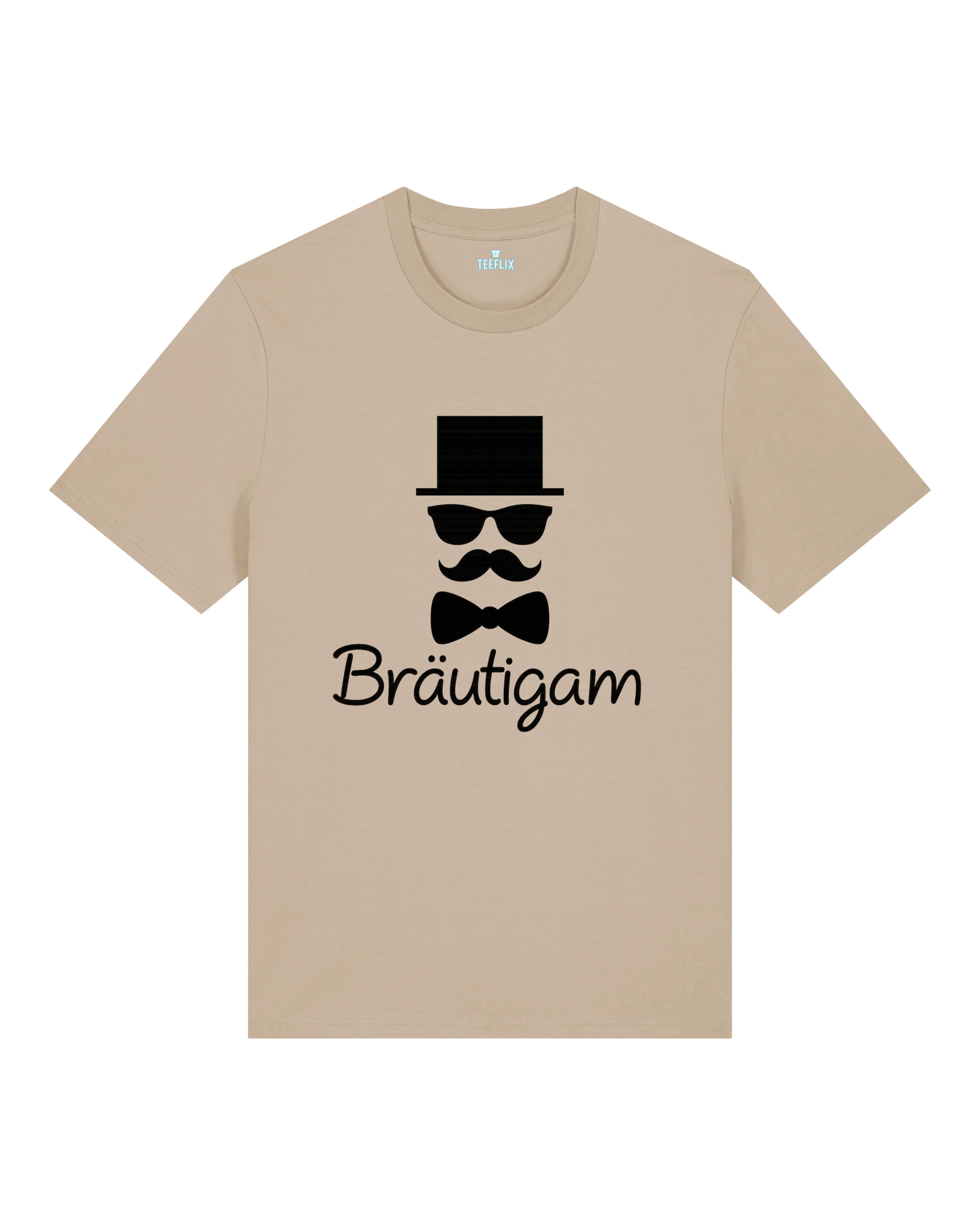Das Teeflix Bräutigam Shirt ist das ideale Outfit für den Junggesellenabschied. Mit dem stilvollen Design aus Hut, Bart, Fliege und Sonnenbrille wird der Bräutigam zum Hingucker beim JGA.